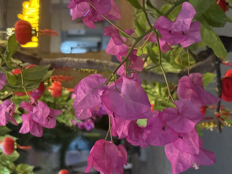The image presents a close-up, vertically oriented view of a bougainvillea plant situated in an urban environment in Nha Trang, Vietnam. The foreground is dominated by numerous sharply defined magenta-pink bougainvillea bracts and associated green leaves. In the midground, a tree trunk is partially visible, from which multiple red, spherical lanterns, each with a dangling red tassel, are suspended. Adjacent to these, yellow string-like decorative elements are also observed. The background is intentionally blurred, revealing indistinct architectural features consistent with a building or storefront. Prominent within the blurred background is artificial yellow illumination from what appears to be signage, with the partial letters "ONG" visibly glowing. A faint blue light source from within a structure is also discernible in the background. No individuals are present within the frame.