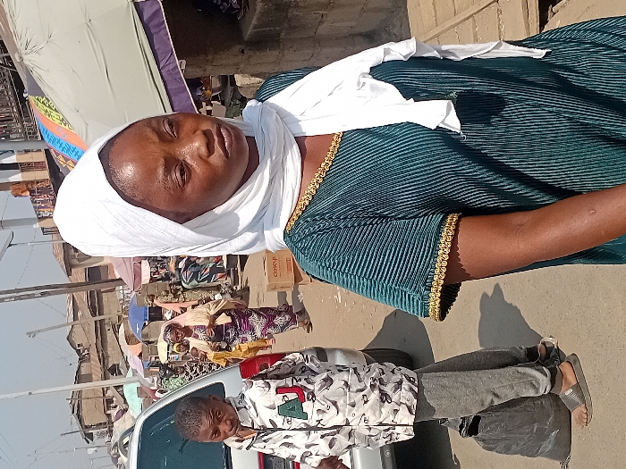 A woman in a green, textured dress and white head covering stands in a bustling outdoor market. A young boy in a patterned shirt and gray pants stands beside a parked silver car. Market stalls with colorful umbrellas and various vendors and shoppers are visible in the background, suggesting a lively and crowded atmosphere. The photo appears to be taken during daylight hours.