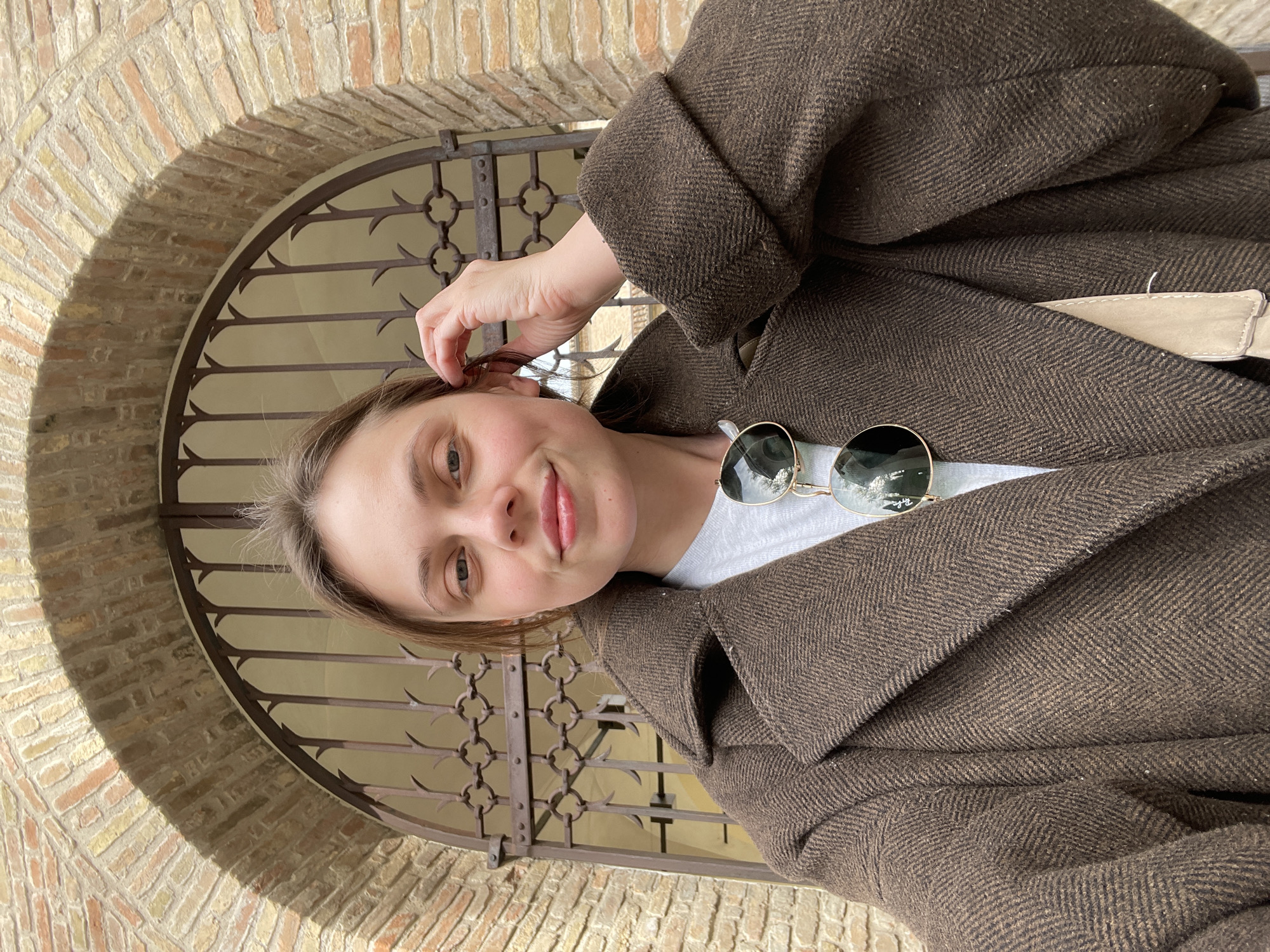 A person is standing in front of an arched brick structure with an iron gate, possibly in Ravenna, Italy, based on the architectural style often found in that city. The person is wearing a brown herringbone coat over a white shirt, with sunglasses resting on the coat. The person's hand is touching their hair. The background consists of a brick archway and a metal gate.