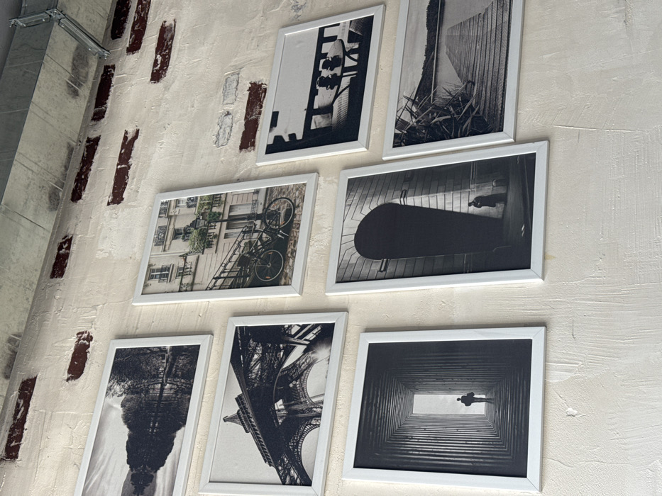 The image displays a section of an interior wall decorated with seven framed black-and-white photographs. The wall itself is textured and off-white, featuring irregular patches of exposed reddish-brown brick. A metallic ventilation duct runs along the ceiling line, secured by a white bracket. The photographs, all in white frames, depict a variety of scenes: * **Top Left (Landscape):** A serene waterscape reflecting trees on the far bank. * **Middle Left (Portrait):** The lower structure of the Eiffel Tower, viewed from below. * **Bottom Left (Portrait):** A person in silhouette walking through a long, diminishing tunnel towards a distant light. * **Top Middle (Portrait):** A street scene featuring a bicycle parked near a staircase and a building facade. * **Bottom Middle (Portrait):** A solitary figure standing under a large architectural archway, with strong light and shadow. * **Top Right (Landscape):** An outdoor café setting with a round table, two chairs, and two cups. * **Bottom Right (Landscape):** A wooden pier extending into a calm body of water, with reeds on the left. The visual content of the image does not provide any specific identifying features or landmarks to confirm the location as Bukhara, Uzbekistan. The framed art prints are generic and do not depict scenes from Bukhara.