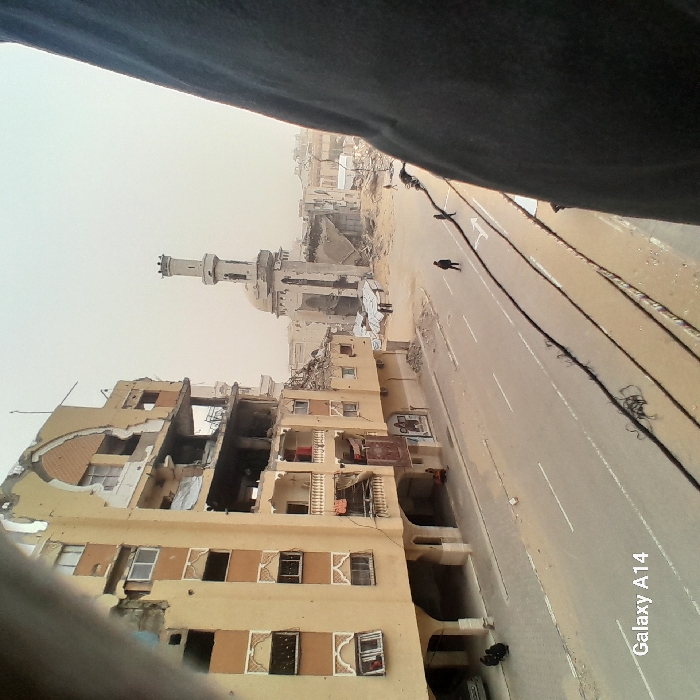 The image depicts a devastated urban street scene in Khan Yunis, Palestinian Territory, under an overcast or hazy sky. The perspective is elevated, looking down onto a paved road and surrounding structures. In the mid-ground, a damaged multi-story building occupies the left side of the frame. Its upper floors exhibit significant structural damage, with collapsed walls exposing interiors, rebar, and debris. Multiple windows are broken or missing, and patterned decorative elements are visible on its facade. Clothing hangs on what remains of balconies on the lower levels. On the sidewalk in front of this building, two individuals in dark clothing are seated near the curb. The street itself is mostly clear, with visible white lane markings. A single person in dark clothing walks centrally on the road. Further down, two other individuals are walking together. Across the lower portion of the image, several dark electrical or communication wires stretch horizontally. In the background and to the right, the most prominent structure is a heavily damaged mosque. Its minaret remains partially standing but shows significant wear, while the dome structure is clearly compromised and surrounded by rubble. Surrounding the mosque are extensive piles of building debris and the remains of other structurally damaged buildings, indicating widespread destruction. A small group of individuals is visible near the mosque. The immediate foreground on the right is obscured by a dark, amorphous object, likely part of a frame or fabric close to the camera lens. The watermark "Galaxy A14" is present in the lower-left corner.