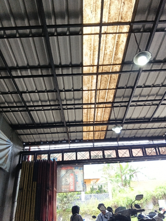 The image depicts an interior view of a commercial establishment, likely a workshop or garage, with an open front leading to an exterior scene in Unknown, Unknown. The overhead structure consists of a dark-colored metal truss system supporting a roof composed of corrugated metal panels and a central strip of translucent, aged, and discolored corrugated plastic or fiberglass panels, admitting natural light. Two illuminated, white, conical industrial-style light fixtures are suspended from the truss system. Below the roof, a horizontal band of small, grid-patterned windows is visible. On the far left, a stack of vertically oriented corrugated metal sheets, painted in reds and yellows, stands against a light-colored concrete wall, adjacent to a draped white tarp. Through the main opening, an outdoor environment is visible. A 'JUTOM' brand oil advertisement banner, detailing "SCOOTER" and "EMD-10W-40," hangs suspended. Beyond this, lush green foliage and trees, along with a distant light-colored residential building featuring a reddish roof, are observed. A retaining wall constructed from dark and light-colored stones is also present. In the lower foreground, two individuals are partially visible. One person on the left wears dark clothing and possibly a head covering, with their back largely to the viewer. Another person on the right wears a light-colored shirt and a dark hat, appearing to look downwards. Multiple motorcycles are present in the lower right, with a prominent black motorcycle showing its handlebars and mirrors. No specific interactions or detailed actions are discernible from the individuals.
