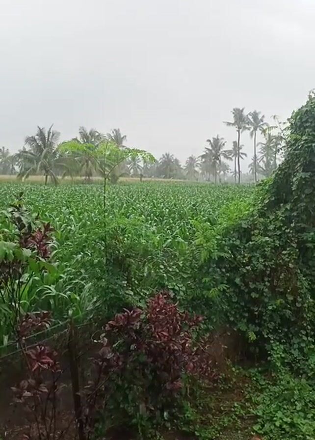 field of lush green crops under a heavy rain. Palm trees are visible in the distance. The field is bordered by dense, green foliage on the right side. Raindrops are visible throughout the frame, creating a blurry effect. The sky is overcast. The image is vertically oriented.