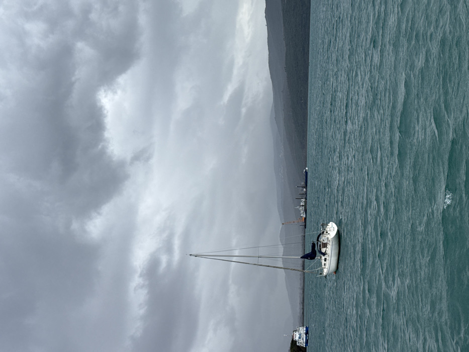 An overhead-level photograph depicts a maritime scene in the city of Dubravcevina, Montenegro, under an overcast sky with heavy grey clouds. The foreground and midground are dominated by choppy, dark blue-green water. A single-masted white sailboat with its dark blue sail cover furled is positioned centrally, gently riding the waves. In the distant left, a white and blue vessel, likely a small ferry or utility boat, is visible. Further right in the background, a cluster of industrial marine infrastructure, including a barge with a crane and other work vessels, is present. The horizon features dark, undulating hills and mountains, partially obscured by haze or atmospheric conditions, indicating a rugged, vegetated coastline. No individuals are visibly present on any of the vessels or in the immediate environment.