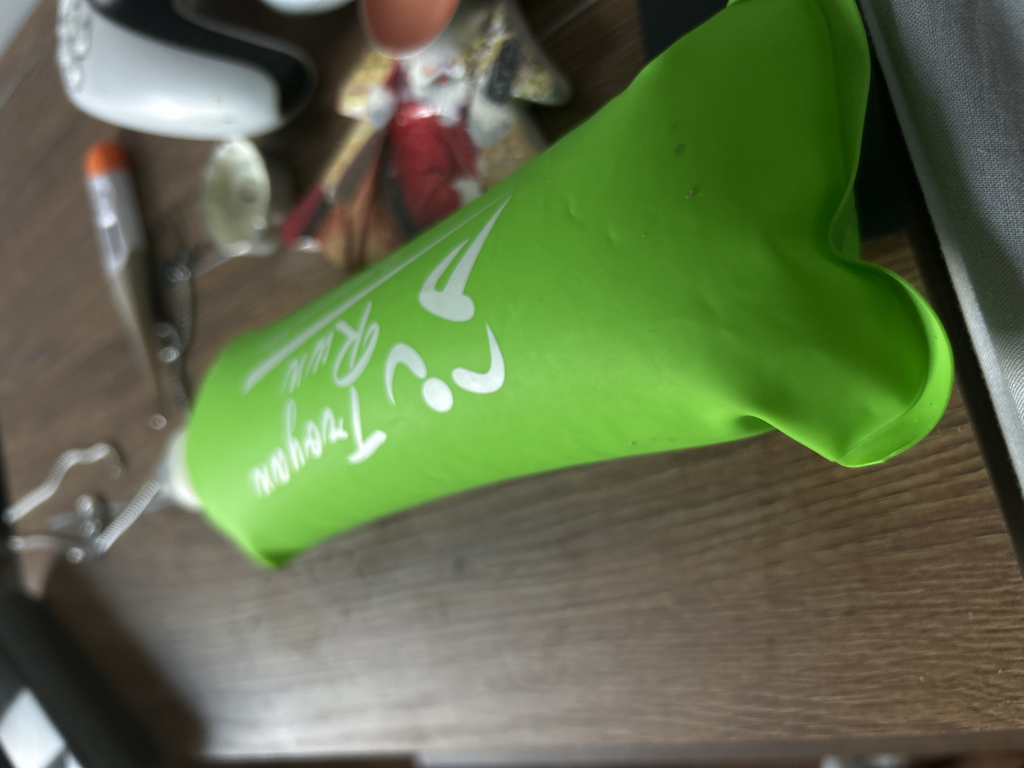 A lime green enema bag labeled "Yo Treoyan Re" sits on a brown wooden surface