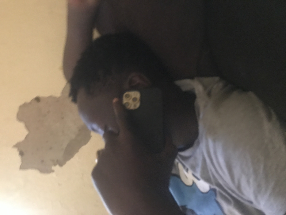 One individual is depicted horizontally, resting on a dark surface in an interior space within Unknown, Unknown. The person has dark skin and short, dark hair, and is wearing a light-colored t-shirt with a partial blue and white graphic visible on the left shoulder area. Their right hand holds a dark-colored smartphone to their right ear, with the phone's rear camera module, featuring multiple lenses within a light-colored square, clearly visible. The background consists of a light yellow wall exhibiting extensive damage, including large sections of peeled plaster or paint revealing a darker substrate. The overall lighting is subdued.