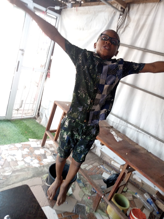 An individual, identified as a young male, stands barefoot in an indoor or semi-enclosed area. He wears black-framed glasses, a patterned short-sleeved shirt, and matching shorts. His arms are extended laterally, and his face displays an open-mouthed, wide-eyed grimace directed at the viewer. His bare feet hover above a black plastic bucket, which rests on a mosaic-patterned tiled floor composed of irregular brown, beige, and white pieces. To the subject's left is a white-framed glass door, secured with a metal grill, leading to a space with green artificial turf. To the subject's right, a wooden bench-like structure supports crumpled foil or paper. Beneath this structure are a yellow bucket, a red and white bucket, a plastic water bottle, and a black plastic bag. The rear wall and ceiling appear to be constructed from a white tarp-like material, revealing exposed support beams. Scattered refuse is visible on the floor. The location is an unidentified structure within Unknown, Unknown.