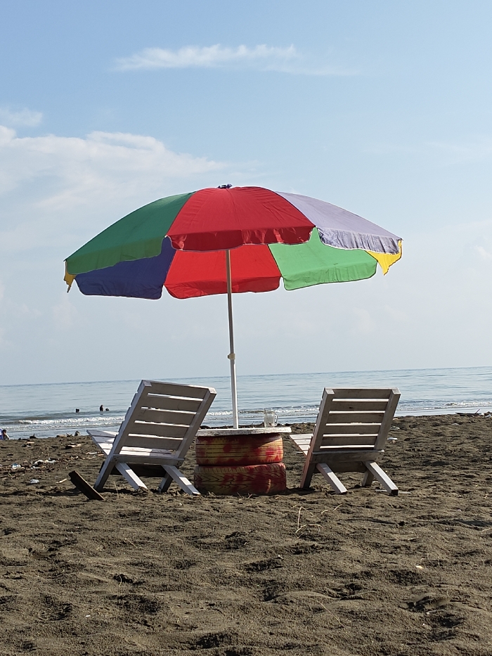 The scene depicts a beachfront in Reudeuep, Indonesia, under a mostly clear blue sky with sparse white cloud formations. The immediate foreground consists of dark brown, granular sand. Centrally located is a multi-colored beach umbrella with distinct panels of red, green, blue, purple, and yellow fabric, supported by a light-colored central pole. Positioned beneath the umbrella are two light-colored, slatted wooden lounge chairs, unoccupied and angled towards the ocean. Between these chairs, functioning as a table, are two stacked automobile tires, painted with a swirling pattern of red and yellow. A single clear glass tumbler is resting on the upper tire. In the mid-ground, the calm, light-blue ocean stretches towards a distant horizon. Small, white-capped waves are visible breaking near the shore. To the left, at least two human figures are partially submerged in the water. The sandy shoreline immediately adjacent to the water displays scattered debris, including small dark objects and what appears to be organic material. No specific human actions or interactions are directly observable among the primary objects or people in the water.