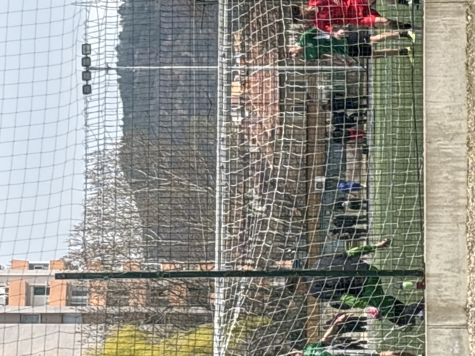 - "The image captures an outdoor football pitch observed through a white, large-mesh netting, likely a goal net or protective barrier, which dominates the foreground" by FM-obecw2, licensed under CC BY 4.0