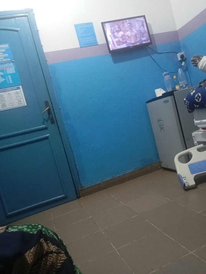 The image depicts a patient room in a hospital. A closed blue door is on the left with a sign attached. The walls are blue with a purple stripe near the ceiling. A television hangs on the wall. To the right of the TV, there's an outlet, a small refrigerator, and a bed with a patterned blue and white pillow. Two water bottles and a small yellow bottle are placed on top of the refrigerator. The floor is tiled in brown. The bottom left corner has a patterned green and brown object.