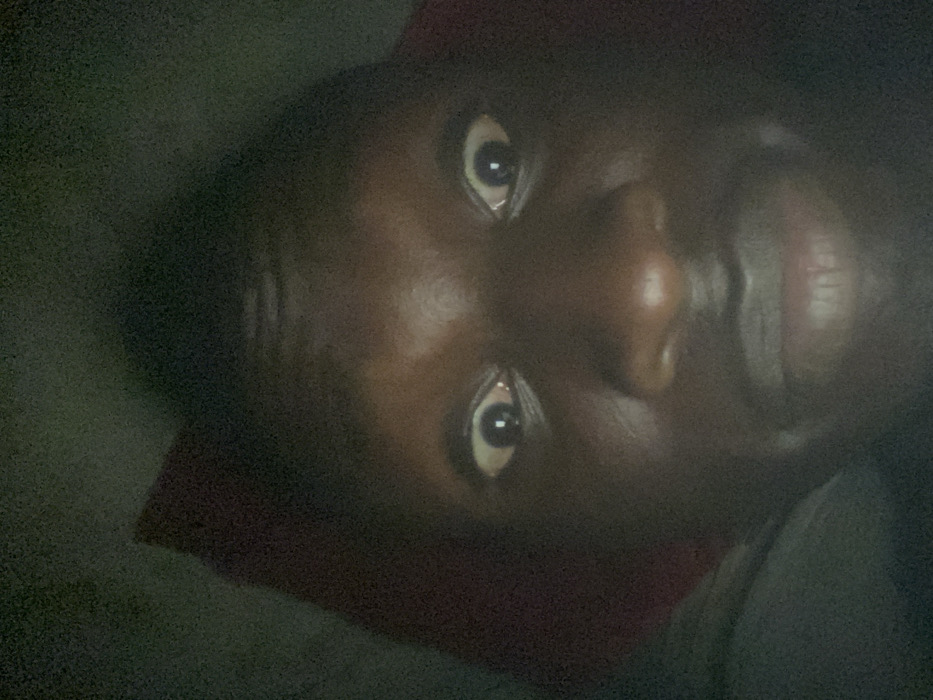 A close-up, dimly lit portrait shows a person with dark skin and wide eyes. The face is tilted slightly, displaying the nose, mouth with visible teeth, and forehead with fine lines. Red fabric can be seen behind the head, possibly a pillow. The overall image is dark and grainy, obscuring fine details.