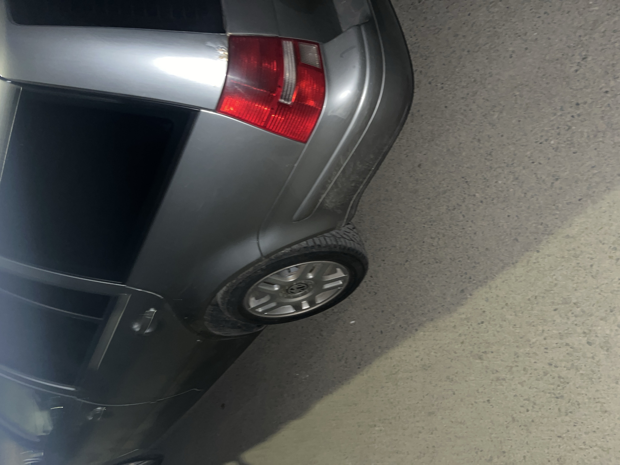 A partial view of a gray car is shown, focusing on the rear passenger side. The car, a Volkswagen, is parked on a gray, rough surface, likely asphalt or concrete. The car's taillight is visible, as is a tire with a silver wheel. The surrounding environment is out of focus, but it appears to be outdoors and potentially at night, given the lighting. No people or other objects are clearly identifiable. The scene is presented from a high-angle perspective. There is no clear information regarding the city of Aytos, Bulgaria in the image.