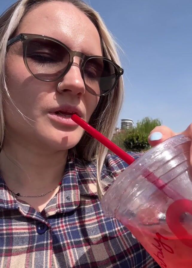 A fair-skinned woman with blonde hair and wearing dark sunglasses and a blue, red, and beige plaid shirt is drinking a red-colored beverage with a red straw from a clear plastic cup with red lettering on it. She has a nose ring on her left nostril. The woman takes a drink, then holds the cup up to the camera. The beverage is presumably a 7-Eleven Slurpee. The sky is visible in the background and is a bright, cloudless blue.
