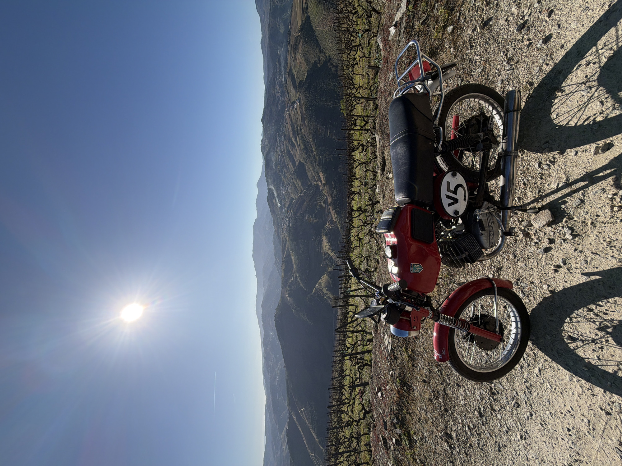 A red motorcycle, marked with the number "V5", is parked on a dirt surface with a mountain range and vineyard in the background under a clear blue sky with a visible sun. The location appears to be in a rural area, likely in the outskirts of Vila Real, Portugal, considering the mountainous terrain and vineyards that characterize the Douro Valley region. The lighting indicates a sunny day. The motorcycle is the primary subject of the image.