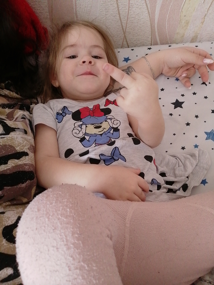 A young child, approximately a toddler or preschooler, is depicted lying down indoors in Chaikovsky, Russia, looking directly at the camera with a slight smile. The child has light brown hair and is wearing a light grey t-shirt featuring a Minnie Mouse cartoon graphic with a red bow, blue hoodie, blue bows, and black polka dots. The child's left hand is raised, with the middle finger extended. The child is also wearing light pink leggings, which show visible pilling. To the right of the child, an adult's right hand is visible, resting with fingers slightly curled. This hand has light pink or nude nail polish, a silver-colored rope chain bracelet on the wrist, and a dark tattoo on the wrist/forearm, resembling a wing design. The immediate background includes a patterned fabric resembling camouflage to the child's left and a white sheet or pillowcase with black and blue star patterns to the child's right. A light-colored, possibly striped or textured, wall is visible behind the child's head.