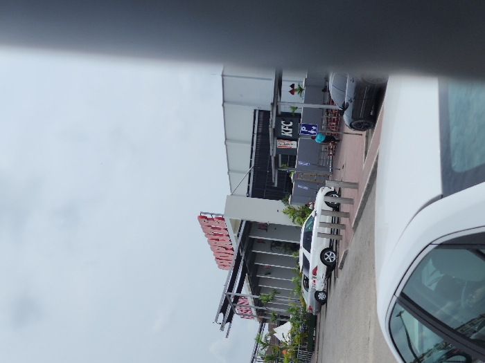 The image depicts the exterior of a commercial complex located in Sangotedo, Nigeria, under an overcast sky. The main building features a prominent red "SHOPRITE" sign on its upper facade. Below, a KFC restaurant is visible, identifiable by its logo, with a pedestrian area in front of it lined with metal bollards and a blue parking sign. A ladder leans against a wall near the KFC entrance. An outdoor parking lot occupies the midground, containing several vehicles. From left to right, a grey sedan is parked, followed by a white SUV. A black sedan is parked closer to the KFC entrance. The immediate foreground is dominated by the hood and roofline of a white sedan, partially obscuring the lower part of the scene. The right side of the image is vertically obscured by a dark, indeterminate object. One individual, dressed in a light-colored shirt, is observed walking near the KFC entrance. Green landscaping elements, including trees and shrubs, are visible throughout the scene, and a white tent-like structure is situated on the far left.