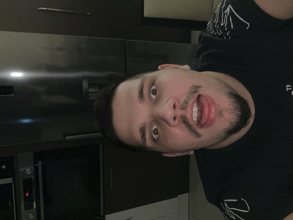 The image depicts a single adult male in an indoor setting. The specific location in the city of Radishevo, Bulgaria, is not discernible from the visual evidence provided. The man, positioned centrally in a close-up, is looking directly at the camera with wide-open eyes and an open mouth, his tongue slightly extended. He has short dark hair and facial hair consisting of a mustache connected to a goatee. He is wearing a black t-shirt featuring white graphic patterns on the shoulders. In the background to the left, dark kitchen cabinetry is visible, along with an oven or microwave unit displaying "CL" on its digital interface and control knobs. To the right, a stainless steel refrigerator with a water/ice dispenser is present, reflecting ambient light. A dark wall with a vertical light-colored mark and a portion of light-colored furniture are visible in the far right of the frame. The scene is moderately lit.