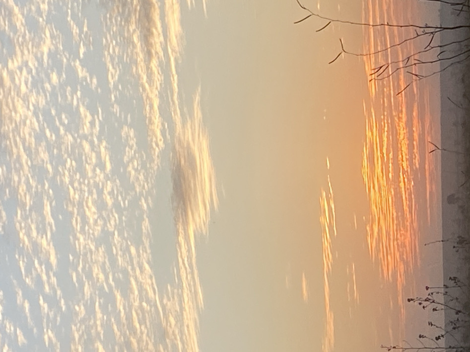 The image showcases a sky divided into distinct sections. The left portion features small, puffy clouds, creating a textured, almost granular appearance. Moving towards the right, the clouds transition into smoother, horizontal bands, reflecting hues of orange and yellow, reminiscent of a sunset. Bare branches and spindly plants are visible at the right edge, silhouetted against the vibrant sky. The overall tone is warm and serene, capturing the tranquil beauty of a fading day.