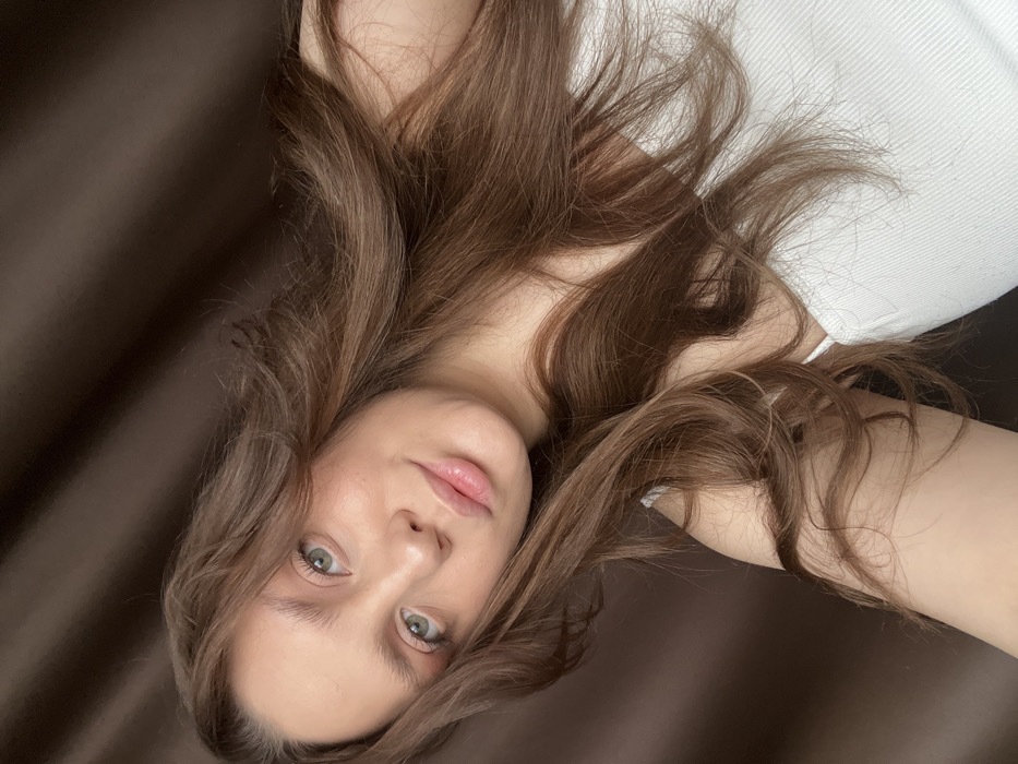 A close-up portrait shows a young adult female with fair skin, light green eyes, and long, wavy, medium-brown hair. She is looking directly at the viewer with a slight smile, her lips appearing glossy. She is wearing a white ribbed tank top with thin straps. The background consists of a uniformly dark brown, vertically folded fabric, consistent with an indoor curtain. No additional objects, actions, or specific geographical identifiers for the city of Chaikovsky, Russia, are discernible within the frame.