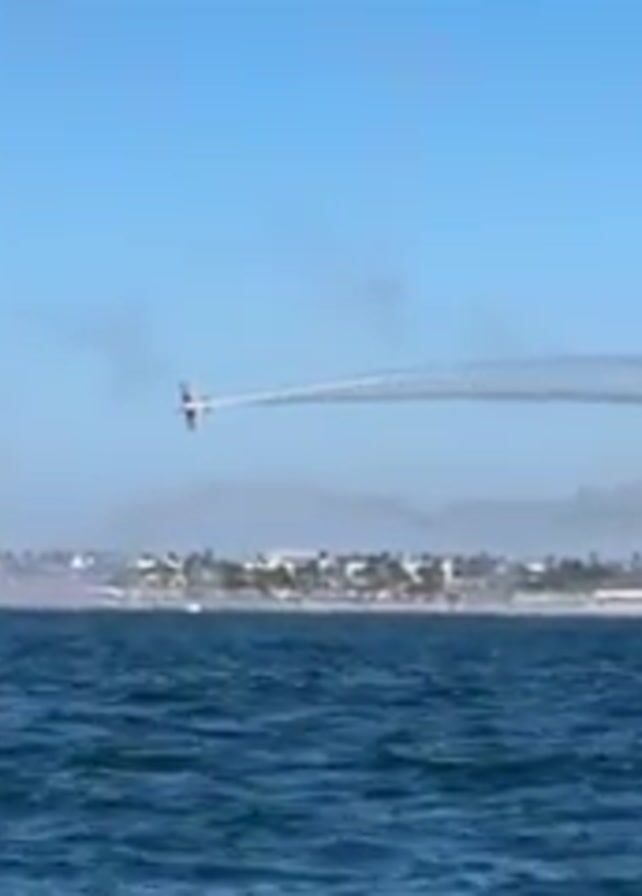 n airplane performing an aerial maneuver over a body of water, likely an ocean, with a coastline visible in the background. The plane, which appears to be red and white, leaves a trail of white smoke as it flies. The coastline is populated with buildings and palm trees, suggesting a coastal city. The sky is clear and blue. The water is a deep blue, with gentle waves. The camera seems to be positioned on a boat or another vessel on the water.