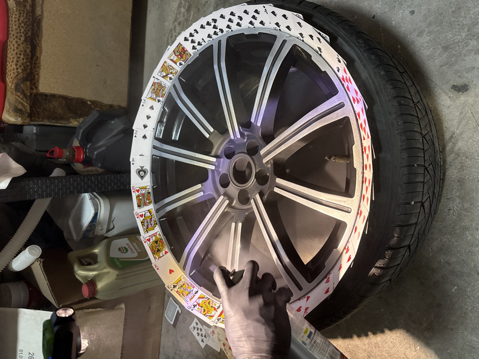 The image depicts an indoor workspace, likely a garage or workshop, without specific visual identifiers to confirm the stated location in Rosen, Bulgaria. In the center, an automotive wheel, silver-grey with multiple spokes, is shown mounted with a black tire, resting on a concrete floor. The outer circumference of the wheel rim is masked by a continuous series of individual playing cards, inserted between the tire and the rim. A person's left hand, covered by a black glove, holds a silver spray paint can and is actively applying paint to the wheel's spokes and central hub. A visible mist emanates from the spray nozzle. A dark-colored flashlight, emitting a beam, is positioned in the upper left background. The background is cluttered, containing objects such as a yellow Castrol Edge fluid container, a white plastic bucket, a black jerrycan with a red cap, cardboard boxes, and a white corrugated pipe. Several loose playing cards are visible on the floor to the left of the tire.