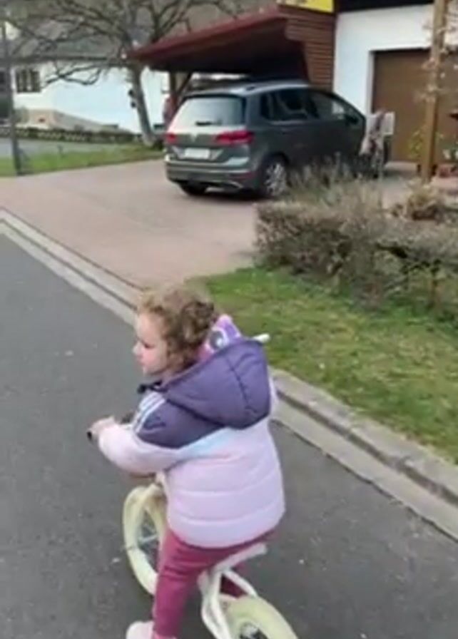 A young child with curly hair rides a white balance bike on an asphalt street. The child is wearing a pink and purple jacket with a light blue stripe, pink pants, and white sneakers. They ride towards the camera and look to the side with a smile. A woman in a black Nike sweatsuit and Converse sneakers walks behind the child. A gray SUV is parked in a driveway near a modern house with solar panels on the roof. The setting appears to be a residential area with trees and greenery visible.