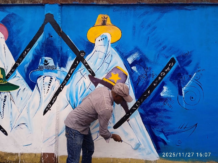 An adult male is observed painting a large mural on a bright blue wall at an unspecified location in Lagos, Nigeria. The individual wears a light grey long-sleeved shirt, blue jeans, and a light-colored cap. He is bent forward, actively applying white paint to the lower section of the mural using a roller brush held in his right hand. The mural depicts multiple stylized figures, primarily rendered in white, suggesting flowing robes or garments, with their faces obscured. Each figure wears a distinct hat: one green with a gold emblem, another blue with a black band, a prominent yellow hat with a black symbol, and a partial view of a hat with a purple band and a yellow star. Centrally positioned across the figures is a large black symbol resembling a square and compass, adorned with intricate white markings along its arms. The background of the mural features various shades of blue, with abstract white brushstrokes around the figures and black swirling patterns on the right side. Paint drips are visible at the base of the wall, indicating ongoing work. A rusty-brown horizontal line marks the top edge of the wall. The date "2025/11/27 16:07" is visible in the lower right corner of the image.