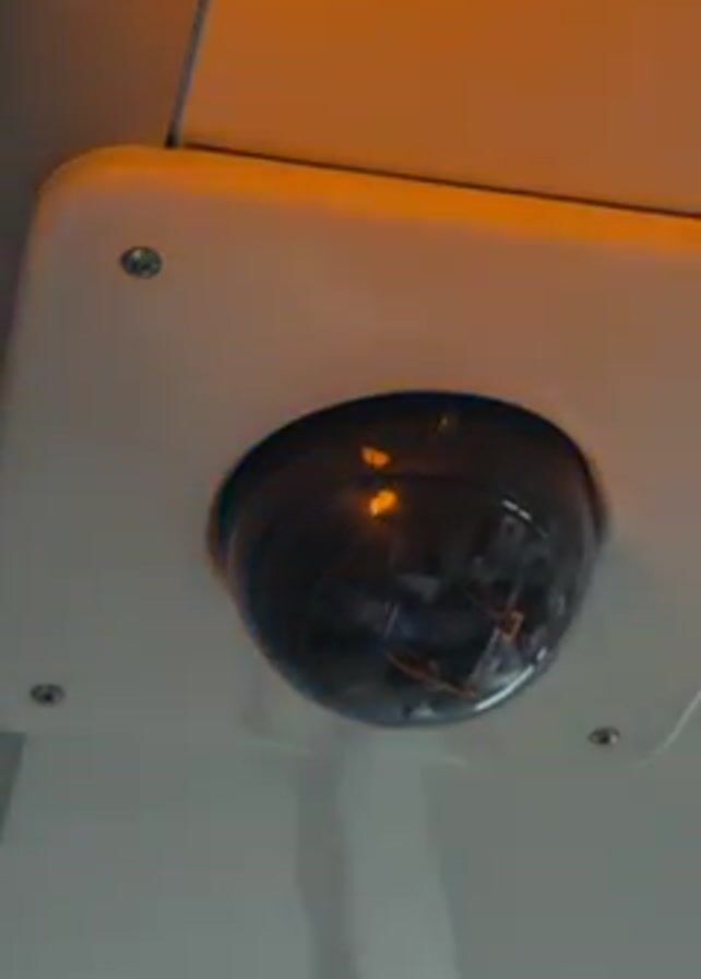 security camera mounted on a white surface. The dome of the camera is dark. The lighting in the room changes from bright white to warm yellow, affecting the color cast of the scene. The camera is stationary.
