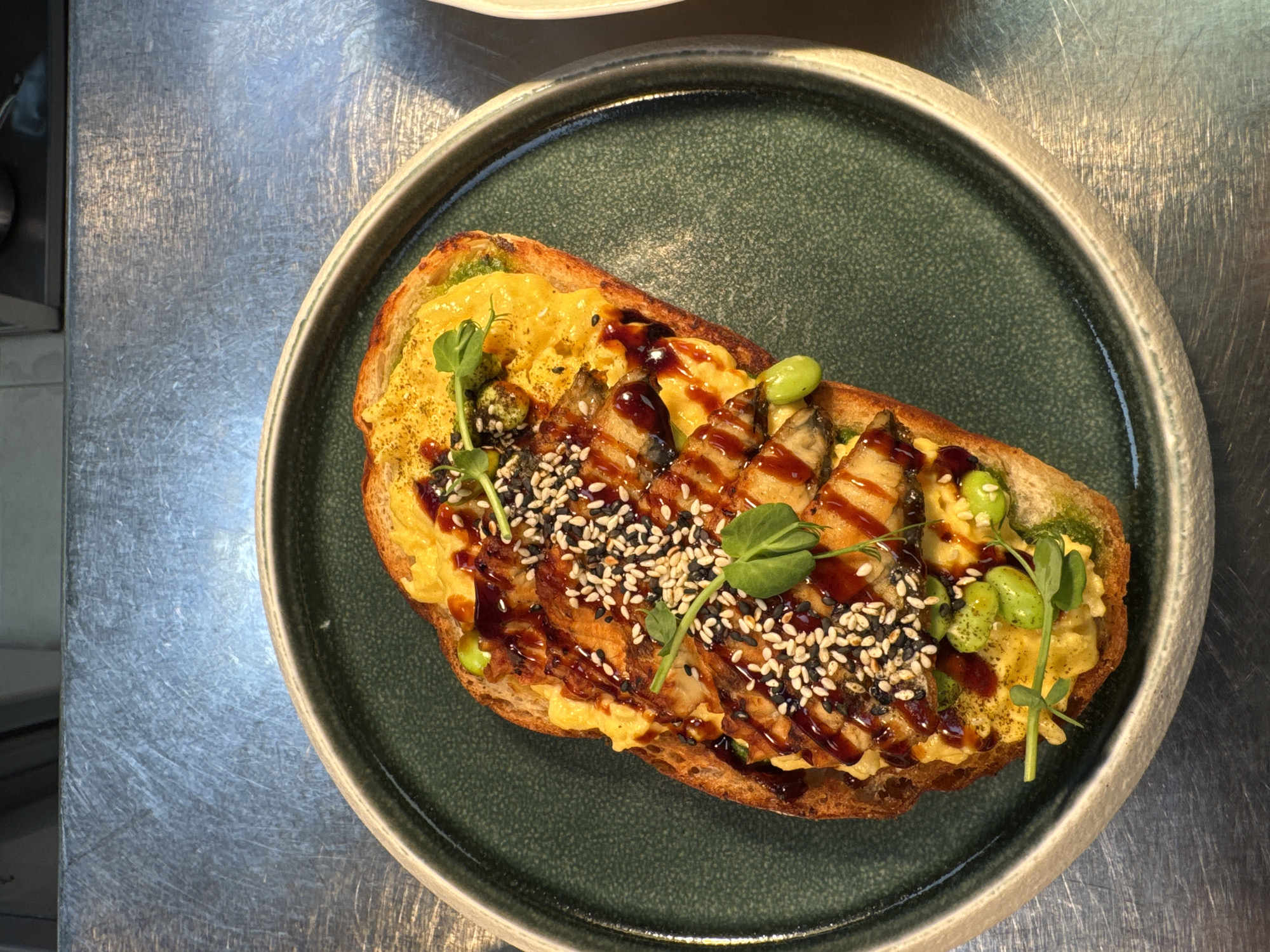 A top-down view shows a single open-faced sandwich on a green ceramic plate with a metallic silver rim, placed on a surface of brushed metal. The sandwich, toasted and golden-brown, is topped with scrambled eggs, edamame beans, what appears to be slices of eel, sesame seeds, a drizzle of dark sauce, and small green sprouts. The plate and sandwich occupy the center of the frame. The surface is utilitarian. The image presents a carefully prepared, elevated brunch item. Location information is not visible in the image.