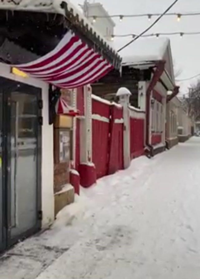 The video depicts a snow-covered alleyway between buildings