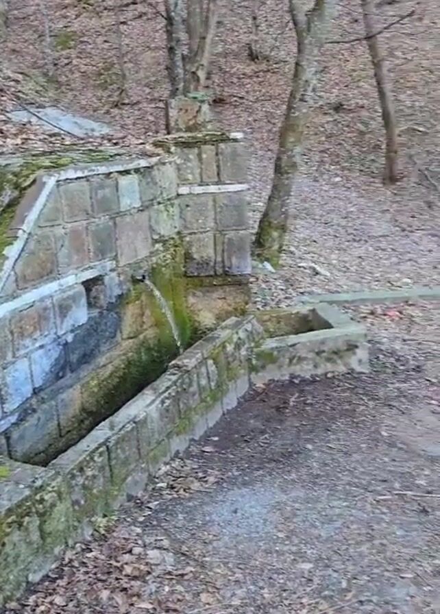 natural spring in a forest. The spring is constructed of stone and moss. A bicycle is lying on the ground nearby. The camera pans across the bike and then to a road with trees in the background. The scene is dry with fallen leaves.
