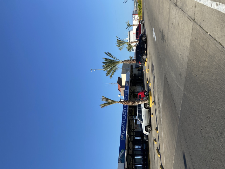 A low-angle, sunny shot depicts a road with parked cars, a building labeled "GRAN CACIQUE EXPRESS," and several palm trees. The sky is a clear, bright blue. The scene is dominated by the road and the building, with cars parked along the edge. Palm trees are interspersed between the vehicles and the building. The image appears to be taken during daylight hours.