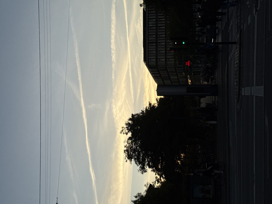 The image depicts an urban streetscape at dusk in Frederiksberg, Denmark, specifically near Frederiksberg Metro Station. The sky transitions from pale blue overhead to a warm yellow-orange hue at the horizon, marked by multiple prominent white contrails and scattered clouds. Several dark utility lines are visible horizontally across the upper third of the frame. In the midground, a large, dark, heavily silhouetted deciduous tree occupies the left-center. To its right, a modern, multi-story building with a dark, grid-patterned glass and frame facade is visible against the twilight sky. A prominent red 'M' logo, indicative of a metro station entrance, is clearly visible at the base of this building. Between the tree and the modern building stands a tall, light-colored cylindrical structure, possibly an information pillar or part of the metro station's ventilation system. The foreground features a dark asphalt roadway with clearly visible white crosswalk lines. A traffic light pole on the right side displays a green light. Numerous bicycles are parked densely along the sidewalks, particularly concentrated near the metro entrance. Several indistinct, silhouetted human figures are present: one individual is seen on a bicycle on the left side of the street, while multiple other figures are walking or standing on the far right sidewalk and near the crosswalk.