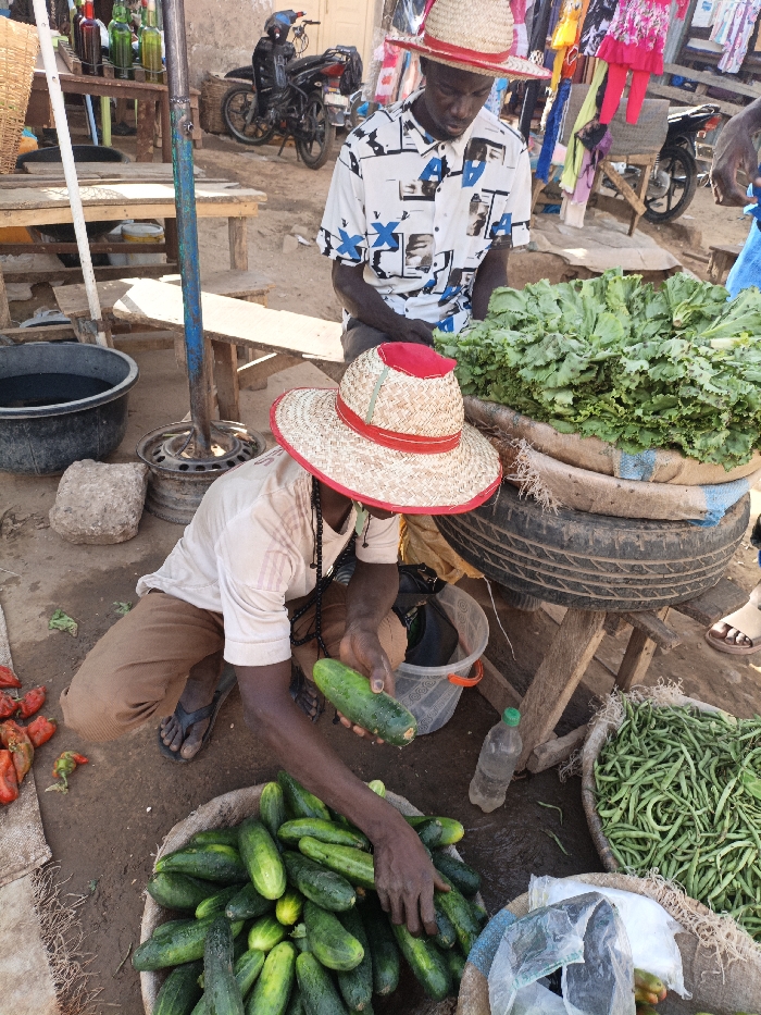 An outdoor market scene in Kawaji, Nigeria, depicts two men engaged with produce stalls under bright daylight. In the foreground, a man squats, wearing a straw hat with a red rim, a light-colored long-sleeve shirt, brown pants, and sandals. He holds a green cucumber in his right hand, his left hand resting among a large pile of cucumbers in a round woven basket on the dirt ground. To his immediate left are red and greenish-yellow peppers. To his right, another woven basket holds green beans, with a plastic water bottle nearby. Behind him, a makeshift stall structure incorporates an old tire supporting a large display of dark green leafy vegetables in a woven sack. Behind this stall, a second man sits on a wooden bench, also wearing a straw hat with a red rim and a white short-sleeve shirt with blue and black abstract patterns, looking down at the produce. The surrounding environment includes a black bucket, an old vehicle wheel rim, additional wooden benches, and a metal pole. In the background, a black motorcycle is parked near a building wall, and various brightly colored garments hang from a display on the far right, suggesting additional market offerings. The ground is unpaved dirt.