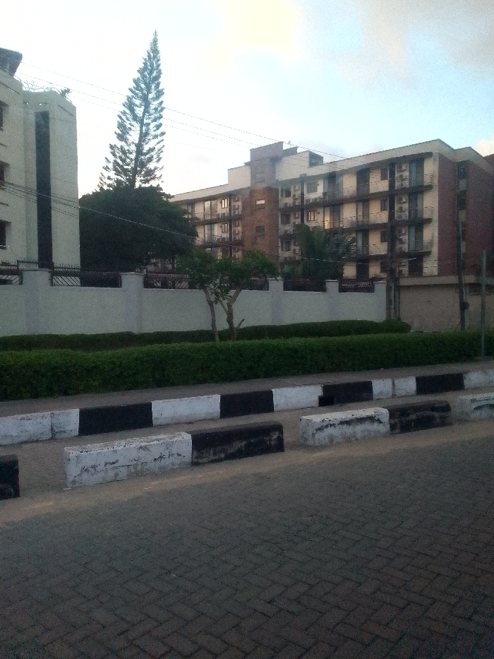 The image depicts an urban street scene in Falomo, Nigeria, under diffused light suggesting twilight or an overcast day. In the foreground, a dark gray interlocking paver road surface is present. Running horizontally across the scene are two staggered rows of rectangular concrete road barriers, alternately painted white and dark gray/black, showing signs of wear and debris. Behind these barriers, a continuous, low, trimmed green hedge borders a light-colored concrete perimeter wall, which is topped with a dark metal fence. A small deciduous tree with light green foliage and two visible trunks stands behind the wall and hedge. Further back, a dense mass of darker green tree canopies is visible. In the background, two multi-story buildings dominate the horizon. On the left, a light-colored building features a prominent dark vertical architectural element. To its right, a larger residential complex with at least five floors exhibits balconies, light-colored facades, sections of red-brown brick, and multiple exterior-mounted air conditioning units. A very tall, slender conifer tree rises sharply between and above the structures on the left side. Power lines traverse the upper portion of the frame against a light blue-gray sky. No individuals are present in the scene.