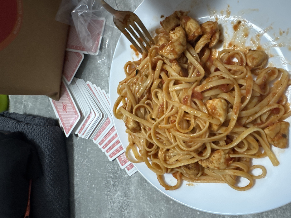 A high-angle, close-up photograph depicts a meal and miscellaneous items on a grey, textured surface, likely indoors in Krems an der Donau, Austria. A white, circular plate, centrally positioned, holds a serving of linguine pasta with diced chicken in a red-orange tomato sauce; a light-colored fork is inserted into the pasta on the right side of the plate, coated with sauce. In the background, to the left, a dark grey folded towel or blanket rests on the surface. To the right of the towel, multiple stacks of playing cards with red backs, each featuring a circular design, are fanned out and piled on the grey surface. Behind the cards, a light brown paper bag with a partially visible red circular logo stands upright. A crumpled clear plastic bag is positioned to the right of the paper bag. A small, bright green object is faintly visible in the upper left background. No people are present in the scene.