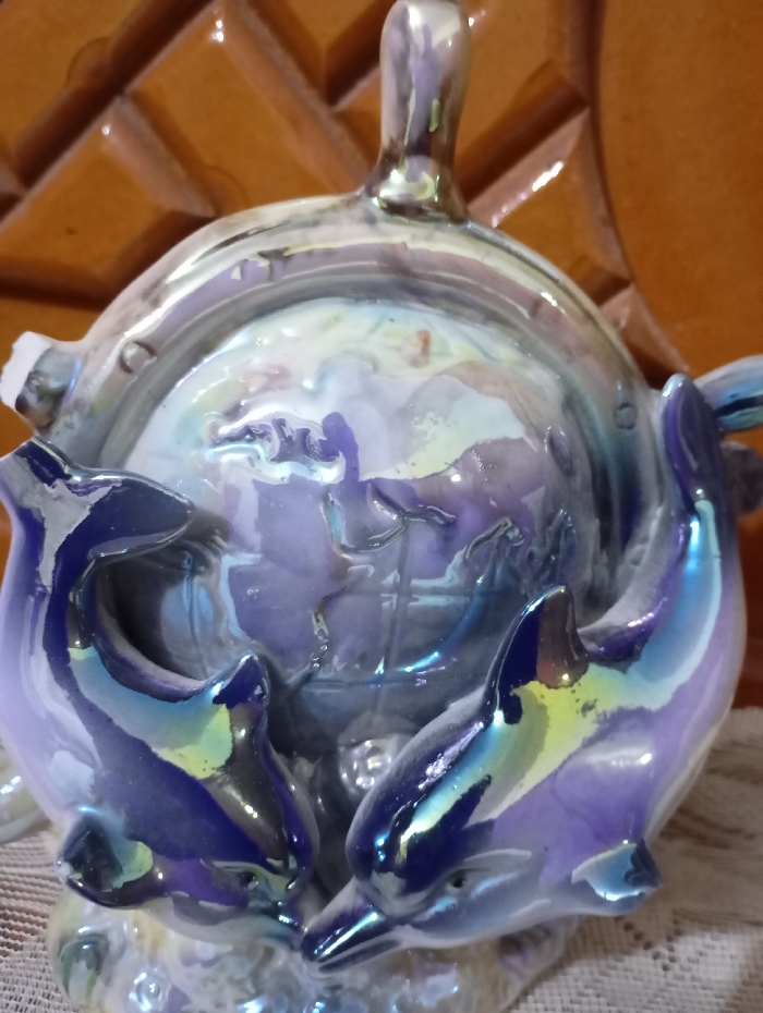 A glossy ceramic figurine features a globe encased within a round, lidded container. Several stylized dolphins, colored with iridescent blue and hints of yellow, adorn the base and appear to support the globe. The lid has a knob on top, and the entire piece has a shiny, reflective surface. A small chip is visible on the left side of the lid. The background shows a textured surface.