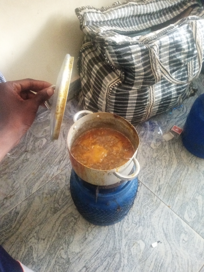 A dark-skinned human hand is positioned in the upper left, holding a metal pot lid with a slight reddish residue on its inner surface. Below the hand, a silver-colored pot with two handles rests on a blue cylindrical gas stove. The pot contains a bubbling, reddish-brown liquid, indicative of a stew or soup being actively heated. The floor is covered with light-toned marble or granite tiles featuring a grey, swirled pattern. In the upper right background, a large, woven bag with a black and white plaid pattern leans against a plain, light-colored wall. Adjacent to the bag on the floor, a small red and white matchbox and a crumpled clear plastic bag are visible. A blue container is partially obscured behind the matchbox. The scene depicts an indoor cooking environment in Unknown, Unknown.