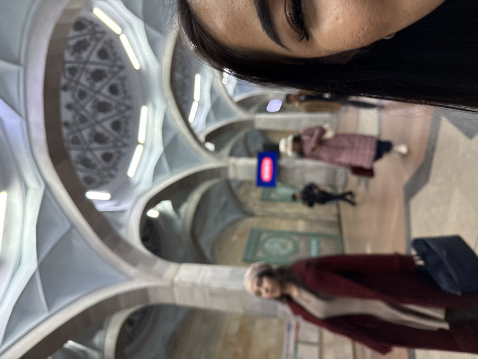 An eye and part of a face are visible in the top right corner. The background shows a building with arched ceilings and intricate patterns. Several people are walking in the background, including one in a maroon coat and another in a purple coat. A blue sign with a red oval is also present. The image appears to be a slightly blurry selfie taken indoors.