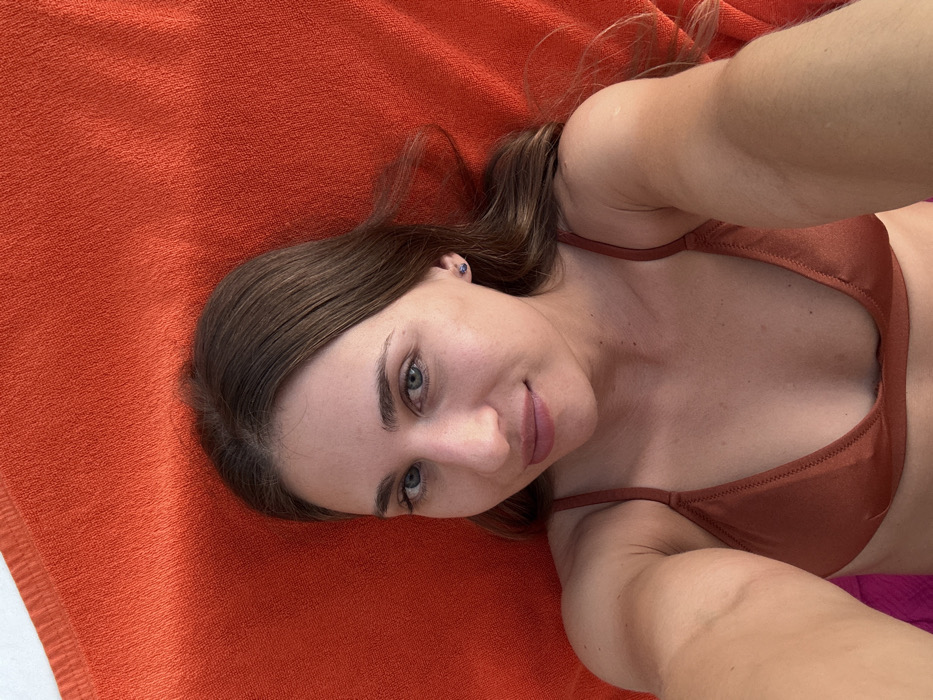 A female individual is depicted in a close-up, high-angle shot, appearing to take a selfie while lying down. Her head is positioned towards the top of the frame, with her body extending downwards. She has light skin, long straight brown hair parted slightly off-center, and blue eyes. Her eyebrows are well-defined, and she has visible eyelashes. Her lips are a light rose color, and she displays a slight, closed-lip smile. Small, purple stud earrings are visible in both earlobes. She is wearing a rust-colored or burnt orange bikini top with thin straps. Her left arm is extended towards the camera, suggesting she is holding the device. The individual is lying on an orange, textured fabric, likely a towel, which covers the majority of the background. A sliver of magenta fabric is visible in the lower-left corner. The specific location within Kamala, Thailand, is not visually verifiable from this image.