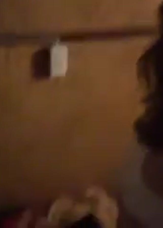 A woman stands in a wooden-paneled room, possibly a sauna or changing area. She wears a white top or bra. The camera moves and focuses on her torso as she lies down. The image then becomes dark and blurry.