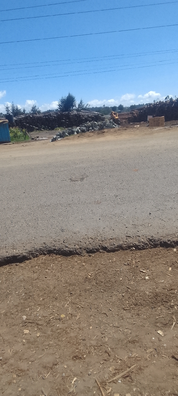 The image depicts an outdoor scene in Flyover, Kenya, under a clear blue sky with scattered white cumulus clouds. In the foreground, the ground consists of dry, light brown soil mixed with wood chips and small fragments. An asphalt road, appearing worn with visible aggregate and minor surface irregularities, stretches horizontally across the midground. The road's edge transitions to the dirt shoulder. Beyond the road, on the left, a small, light blue, rectangular structure, possibly a kiosk or shed, stands near an area of green vegetation. To the right of the road, a significant industrial or storage area is visible, dominated by large, horizontal stacks of cut timber and logs. Adjacent to these log piles, a substantial mound of grey, angular rocks or aggregate is present. Further to the right and partially obscured by the timber stacks, a yellow excavator is visible. Stacks of reddish-brown building materials, resembling bricks or blocks, are also arranged on the far right side of this area. A line of green trees and dense foliage forms the distant horizon. Multiple dark, horizontal utility lines are stretched across the upper third of the clear sky. No individuals are present, and no specific actions or interactions are captured.