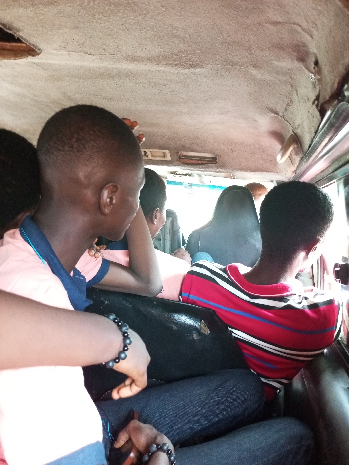 interior of a small passenger van in Idah, Nigeria (7.13 latitude, 6.749 longitude). Four young men are sitting in the back, their bodies tightly pressed together. The man in the center is wearing a red and white striped shirt, while the man on his left is wearing a blue shirt. The man on his right, who is wearing a pink shirt and dark jeans, is leaning against the man in the center. The fourth man is wearing a blue shirt and is partially obscured by the other men. The men are facing forward and appear to be looking out the window. The van's interior is worn and dirty, with a large tear in the fabric of the seat. The windows are partially open. The van is located in Idah, Nigeria.
