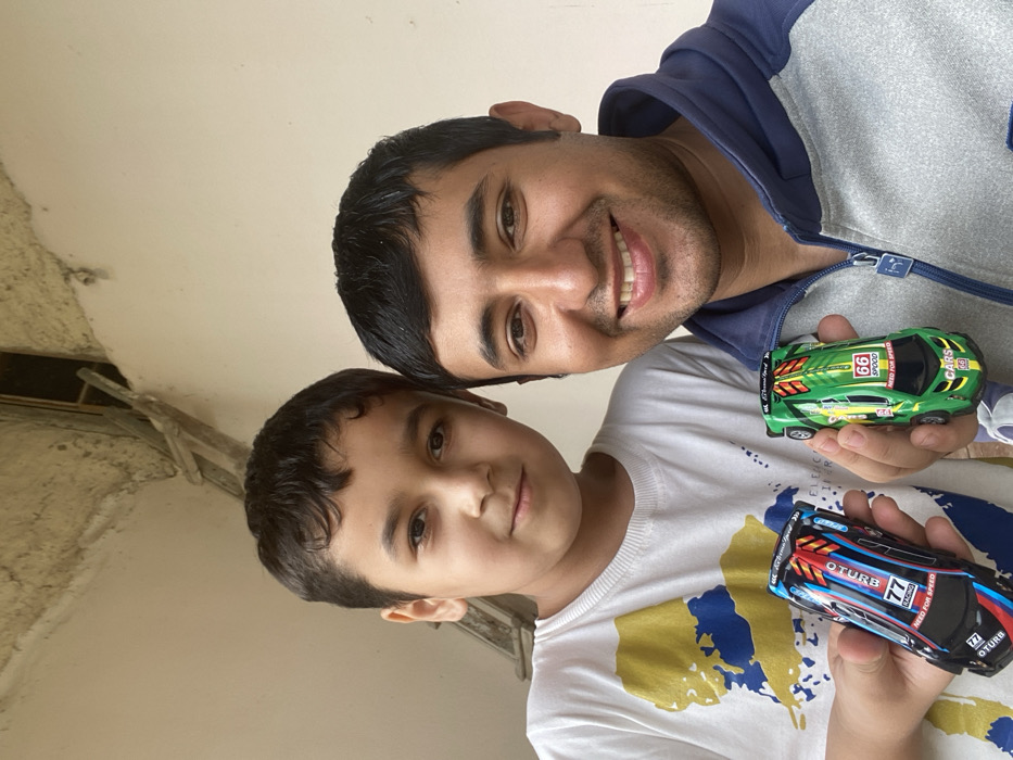 A young boy and an adult male are positioned side-by-side, holding toy cars and looking directly at the camera. The setting is an outdoor or semi-outdoor location in the city of Unknown, Unknown, characterized by a light-colored, plain wall as the background. The boy, situated on the left, appears approximately 6-10 years old, with dark hair and a neutral expression. He wears a white short-sleeved t-shirt with a blue and yellow graphic design. In his left hand, he holds a black toy race car featuring blue, red, and white decals, the number "77," and text including "OTURBO" and "NEED FOR SPEED." The adult male, on the right, appears to be in his 20s or 30s, with dark hair and light facial stubble. He is smiling broadly and wears a grey and navy blue zip-up hoodie. In his right hand, he holds a green toy race car with yellow and black decals, the number "66," and text including "CARS" and "NEED FOR SPEED." The wall behind them shows visible signs of wear, including chipped plaster and a darker substrate exposed in the upper left quadrant. A rudimentary wooden structure, possibly a support beam or ladder, is partially visible in the upper left background, leaning against the wall. The lighting is even, suggesting ambient conditions.