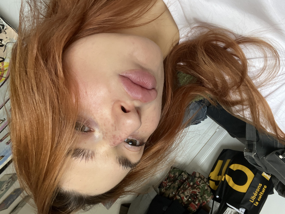 The image depicts a close-up, angled portrait of a individual with reddish-brown hair and a light complexion, situated indoors in Ivry-sur-Seine, France