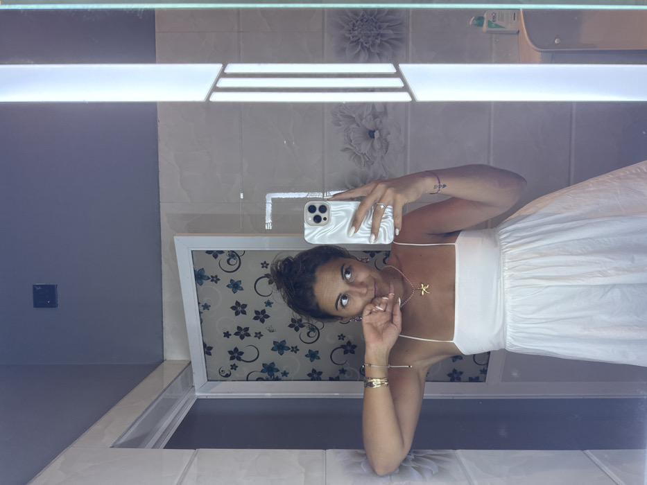 A woman poses for a mirror selfie in a bathroom. She wears a white dress with thin straps and gold jewelry. Her hair is tied up. A smartphone is held up to take the picture. The bathroom features tiled walls with floral patterns, a rectangular mirror with a bright light fixture above, and a white-framed window or panel with blue floral designs behind her. A dispenser is visible on the top right corner of the mirror.