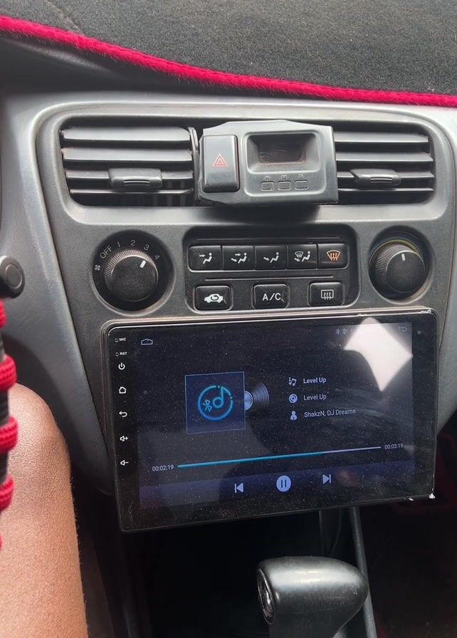 The camera is positioned inside a car, focused on the dashboard. The dashboard is grey and has a black mat with red trim. Above the aftermarket radio is a set of air conditioning vents and buttons. The radio is playing a song called "Level Up" by ShakzN, DJ Dreams. The gear shift is visible below the radio. Part of the driver's leg, wearing a red bracelet, is visible on the left. The windshield is partially visible in the background.