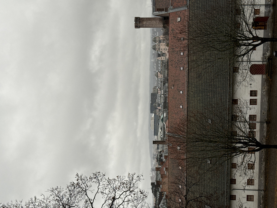 The image displays an elevated, static view of Oslo, Norway, observed from a vantage point consistent with Akershus Fortress, under a uniformly overcast grey sky. No individuals are present. In the foreground, a two-story white building with a dark grey-tiled gabled roof occupies the lower portion of the frame. It features numerous small, rectangular windows with red frames, evenly distributed across its facade. A central red arched wooden door is located on the lower level. Two leafless deciduous trees with dark, intricate branches stand directly in front of this structure, positioned roughly in the center and right-center. The ground immediately in front of the building is dark and appears to be packed earth or pavement, with some scattered detritus. Immediately behind this white building, a roof covered with reddish-brown tiles extends across the midground. Several small, rectangular skylights or dormer windows are visible along its length. A tall, cylindrical brick chimney with a castellated top rises prominently from behind this roofline on the right side of the frame. The background reveals a dense cityscape of Oslo, composed of a variety of multi-story commercial and residential buildings with diverse roof styles and facades. Prominent features include a distinctive light pink building with multiple ornate domes and towers situated in the middle-right background, along with several larger, modern structures with dark or light facades. The urban landscape extends towards a distant, undulating horizon line. A large leafless tree branch partially frames the left side of the image against the sky.