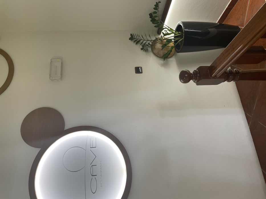 The scene depicts an interior hallway or stairwell landing within a building identified as "CAVE RESTAURANTE" in Fátima, Portugal. The dominant feature is a large, backlit circular sign mounted on an off-white wall, displaying the word "CAVE" in stylized capital letters above "RESTAURANTE." Above "CAVE," two abstract circular shapes are outlined. Two additional, non-illuminated, brown wooden circles are affixed to the wall, flanking and slightly above the main sign, forming a subtle silhouette. Above and to the right of the illuminated sign, a translucent rectangular wall-mounted device, possibly an emergency light or sensor, is visible. Further right and lower, a small, dark rectangular electrical switch or outlet is present. In the lower right quadrant, a polished reddish-brown wooden stair railing, featuring a turned newel post topped with a round finial, ascends diagonally upwards. Beneath the handrail, an illuminated strip of ambient lighting casts a glow onto the wall. Adjacent to the railing, in a corner, stands a tall, black, glossy cylindrical planter holding a green leafy plant with multiple stalks. Behind the planter, a light-colored, circular wooden disc is mounted on the wall. The floor visible in the lower right consists of reddish-brown terracotta-style tiles arranged in a pattern. No individuals or animals are present in the image.