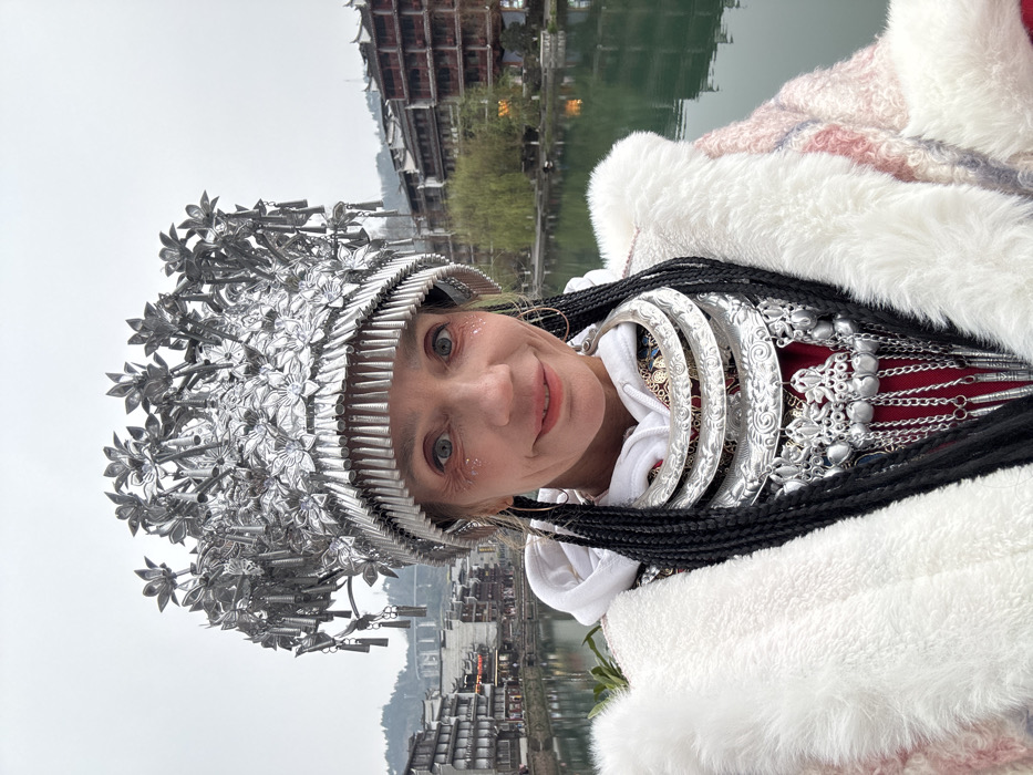 A Caucasian female, appearing to be in her 40s or 50s, is depicted in a close-up portrait, looking directly at the camera with a slight smile. She is positioned on what appears to be a bridge or riverside walkway in Fenghuang, China. Her blue eyes are accentuated with dark eyeliner and white glitter applied below the lower lash lines. Her hair is styled in numerous black braids that hang down her chest. She is wearing an elaborate silver-colored traditional Miao headdress featuring multiple tiers of floral motifs, leaves, and small dangling elements, with a rim composed of vertically arranged cylindrical pieces. Around her neck, she wears several large, stacked silver-colored necklaces, including multiple wide, crescent-shaped or torque-style collars with engraved patterns, and a complex chest ornament with numerous chains, bells, and pendants over a red garment. This traditional attire is layered over a white hooded sweatshirt and a white faux fur-trimmed coat, the interior of which (on the viewer's left) is a textured pink and white fabric. The background features the tranquil, greenish-blue Tuojiang River, reflecting the overcast sky and distant structures. Along the far bank, traditional multi-story wooden buildings with dark roofs and intricate details line the waterway, characteristic of Fenghuang Ancient Town. A large, light-green deciduous tree is visible near the river's edge on the opposite bank. In the far distance on the left, an elevated modern bridge or road structure spans the landscape, indicating contemporary infrastructure within the ancient city setting. The sky is uniformly overcast and light gray.